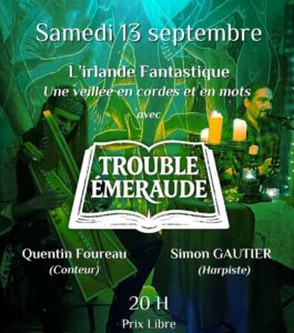 Trouble-Émeraude naît de la volonté de faire dialoguer deux arts ancestraux : la harpe, avec Simon GAUTIER avec sa douce force évocatrice, et le conte avec Quentin FOUREAU, porteur de mémoire, d’onirisme et d’émotions profondes.Avec Trouble-Émeraude, le public est convié à une traversée poétique au cœur de la culture irlandaise et de ses élans fantastiques : des púcas gardiens des tombes aux merrows des profondeurs marines, en passant par les légendes de bière, de vin et de corbeaux diaboliques, puis par les mythes fondateurs des anciens âges.